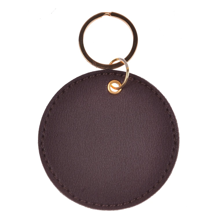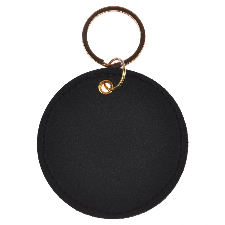 - This keychain has a sleek round design.